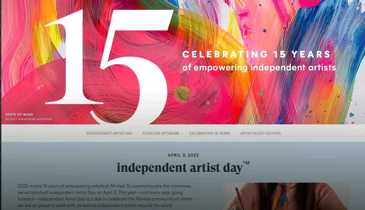 In 2022 Minted began celebrating the artists that make up the company and the community that surrounds the work they do with the campaign Independent Artist Day. As Director of Creative Production I worked on this campaign from kick off to completion leading the Post Production team to repurpose existing archived images with new art, led the in house designers in new asset generation and partnered with All Is Well to create the video content.